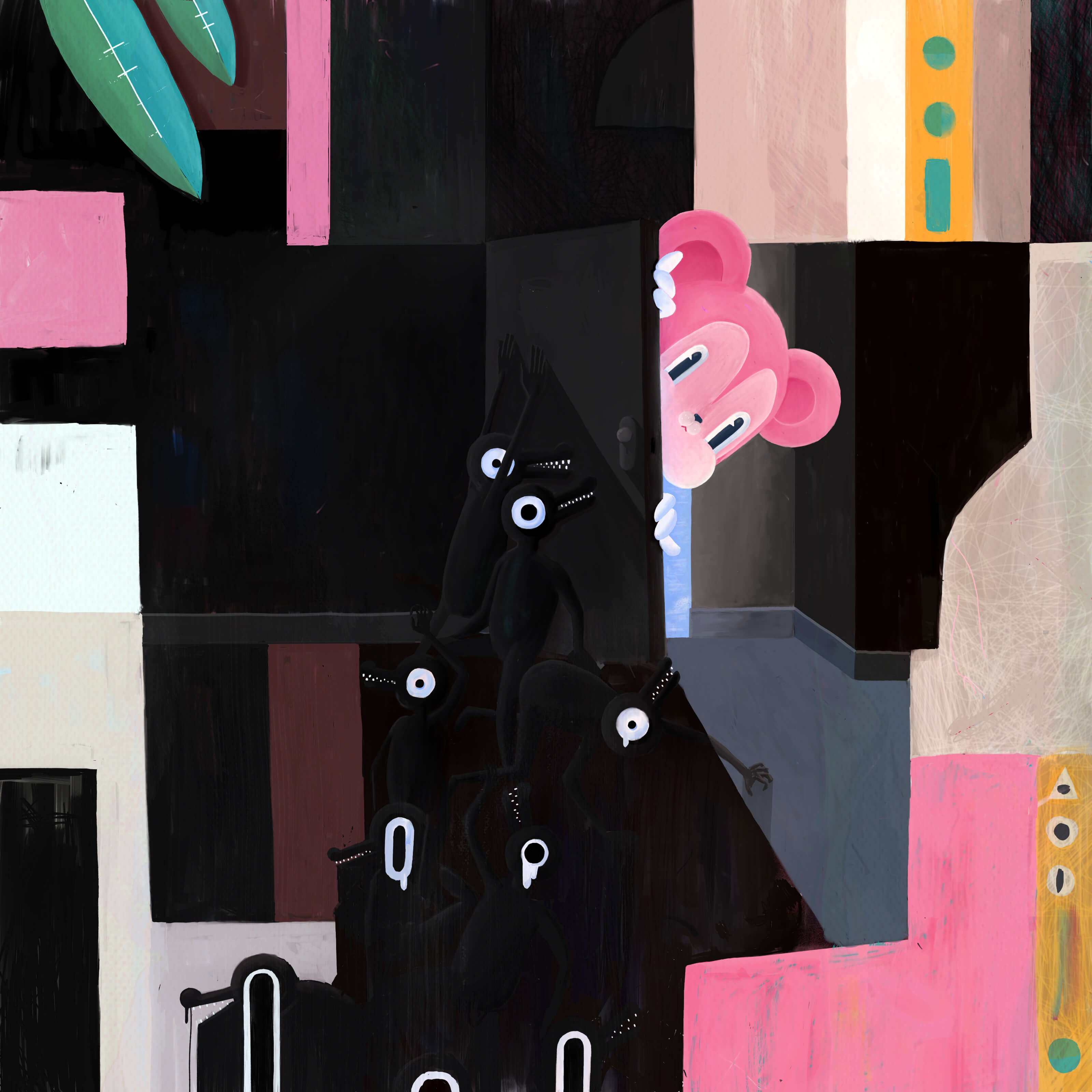 Well, there is that door in my head. It traps me in a tiny room. Even if I don’t like this place too much I’m not able to open that freaking door to step out. Wanna know why? I’m scared. At least these guys in front of the door said that to me. They introduced themselves as “THOUGHTS”. I have known them since my childhood. Eventually we became friends and together we formed a gang called “FEAR”. True that, the name is a bit weird... The rest of the gang is not doing well when I get closer to that mysterious door. They will always find arguments so that I don't leave this room. Telling me, it's dangerous on the other side, after all, I could get hurt. I think they just love my presence. Well, what would THOUGHTS be without my company, without the attention I pay to them? So I tried to make myself a bit comfortable in that prison. I have to admit that it took some effort to give the room a new coat of paint. I was very ambitious to redesign everything and even when a few annoying gang members moved out, I always found myself in this small club house with new strange THOUGHTS moving in. The air seemed to be getting thinner and thinner until I finally gave up. Totally exhausted I admitted to myself that I will probably never leave this room. I gave up on my resistance and started to accept my situation. The concerned THOUGHTS decided to leave. They allowed me to pause for a minute when suddenly there was a knock on the door. I was surprised. There has never been a sign of life from the other side of the door before. A little hesitantly I said: "Come in..." I prepared myself for the worst while the door opened slowly and then there was that…. well ... that giant pink mouse in the doorway. What the heck? I must have been on drugs or something. That was definitely not what I would have expected. This thing was cute. What was i scared of all the time? For sure, at first that giant rat seemed a bit creepy to me, but we got along well and so I found out that the mouse comes from a beautiful place which is on the other side of that door. It is unlimited and full of trust, tolerance and acceptance. It wasn't long before my gang, you remember, the THOUGHTS got wind of it. Since the door was already opened I decided to take them with me. Immediately they followed their usual habits. They locked doors. This time, however, from the outside. THE END!!1 ...ah, forgot to say that... that beautiful place on the other side of the door is called “LOVE” just like the new name of our gang. <3